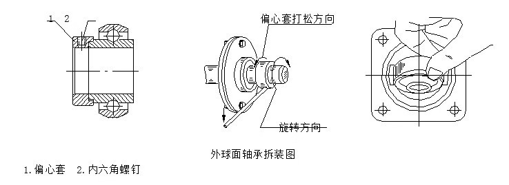 1. 軸承上帶有偏心套時先擰松偏心套上鎖緊螺釘,然后用小鐵棍插入或頂著偏心套上的沉孔,逆著軸的旋轉方向打松偏心套(見圖)。